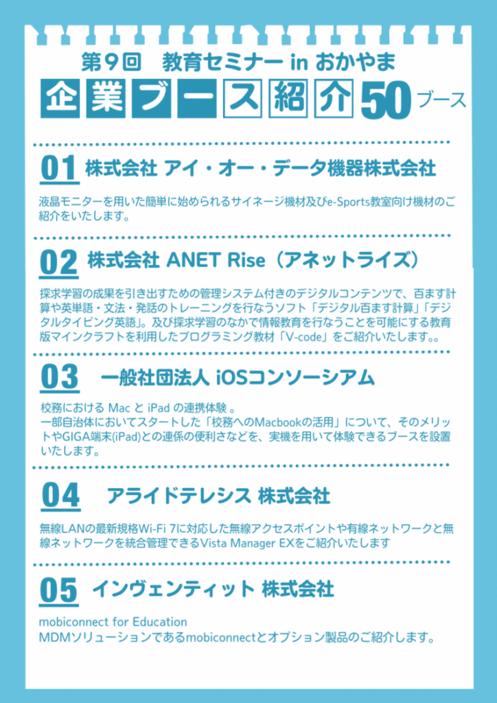 「教育セミナーinおかやま」は本年は49社の協賛をいただき開催いたします。